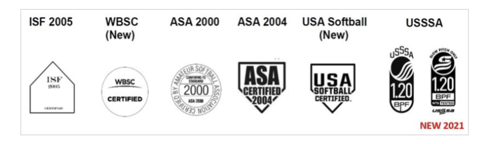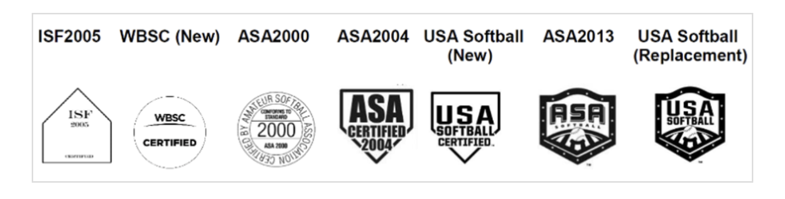 As of Jan. 1, 2023, all softball bats must have either one or a combination of these stamps below.